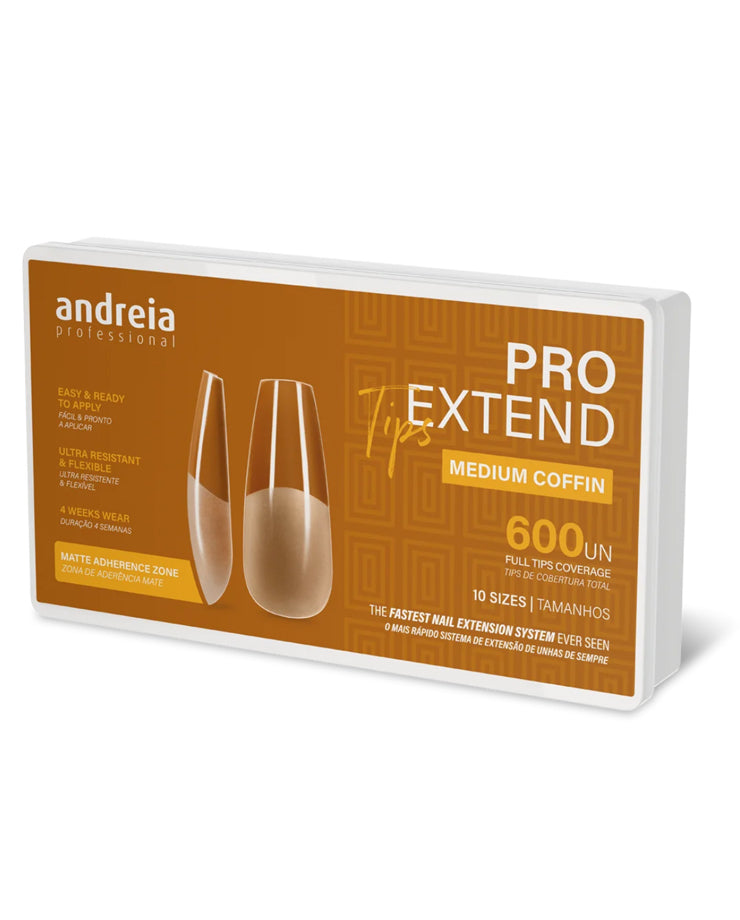 Las extensiones de uñas Andreia Pro Extend Tip ofrecen una solución rápida y profesional para una manicura impecable. Con aplicación sencilla y cobertura total, estas tips están diseñadas para adherirse perfectamente sin necesidad de limado previo gracias a su acabado mate. Disponibles en 5 formas predefinidas, incluyendo el versátil Medium Coffin, combinan flexibilidad y resistencia extrema para garantizar durabilidad hasta 4 semanas sin roturas ni desprendimientos. Ideales para salones y uso personal.